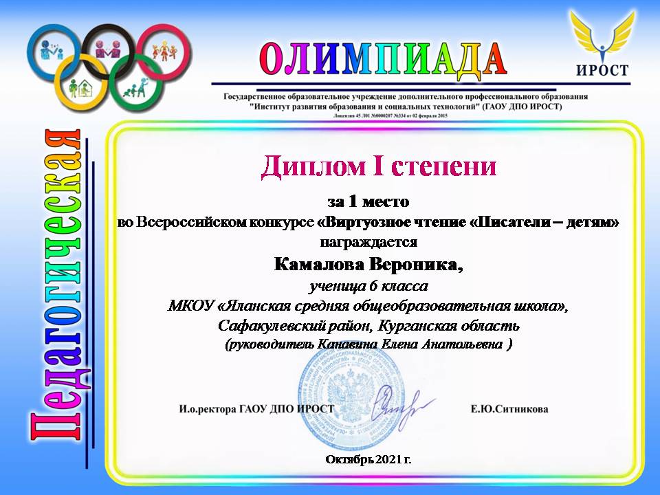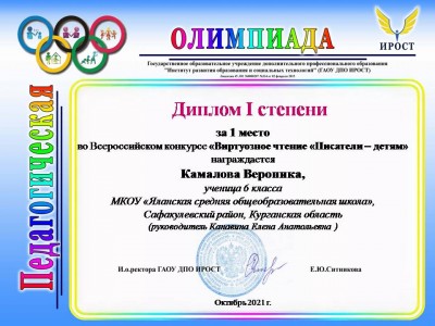 Моя ученица - Камалова Вероника - заняла 1 место во Всероссийском конкурсе "Писатели - детям". Она прочитала отрывок из сказки Л. Кэролла "Алиса в стране чудес".