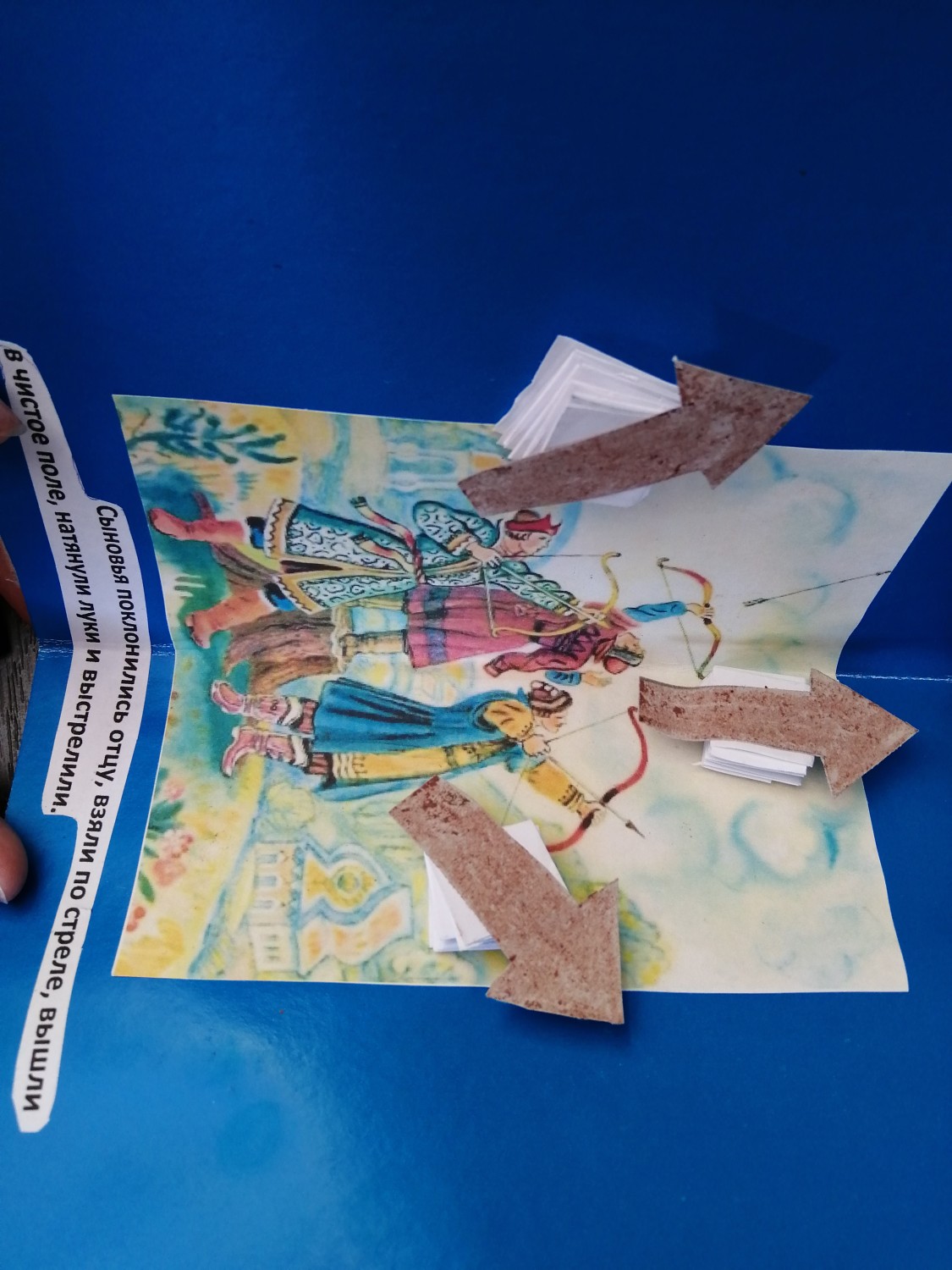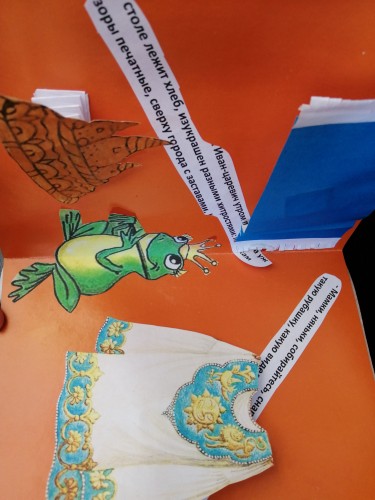 С пятиклассниками создали книгу в технике "POP-UP" по сказке "Царевна - лягушка". "POP-UP" - это техника создания объёмных подвижных иллюстраций на основе бумажных конструкций. Данные конструкции позволяют приводить в движение и поднимать иллюстрации, делая их объёмными. Каждая страница содержит красочные картинки, которые можно поднимать или перемещать, информационную наполненность. Проект предназначен для всестороннего изучения и углубленного анализа текста сказки, а также для семейного чтения, игры и обучения.